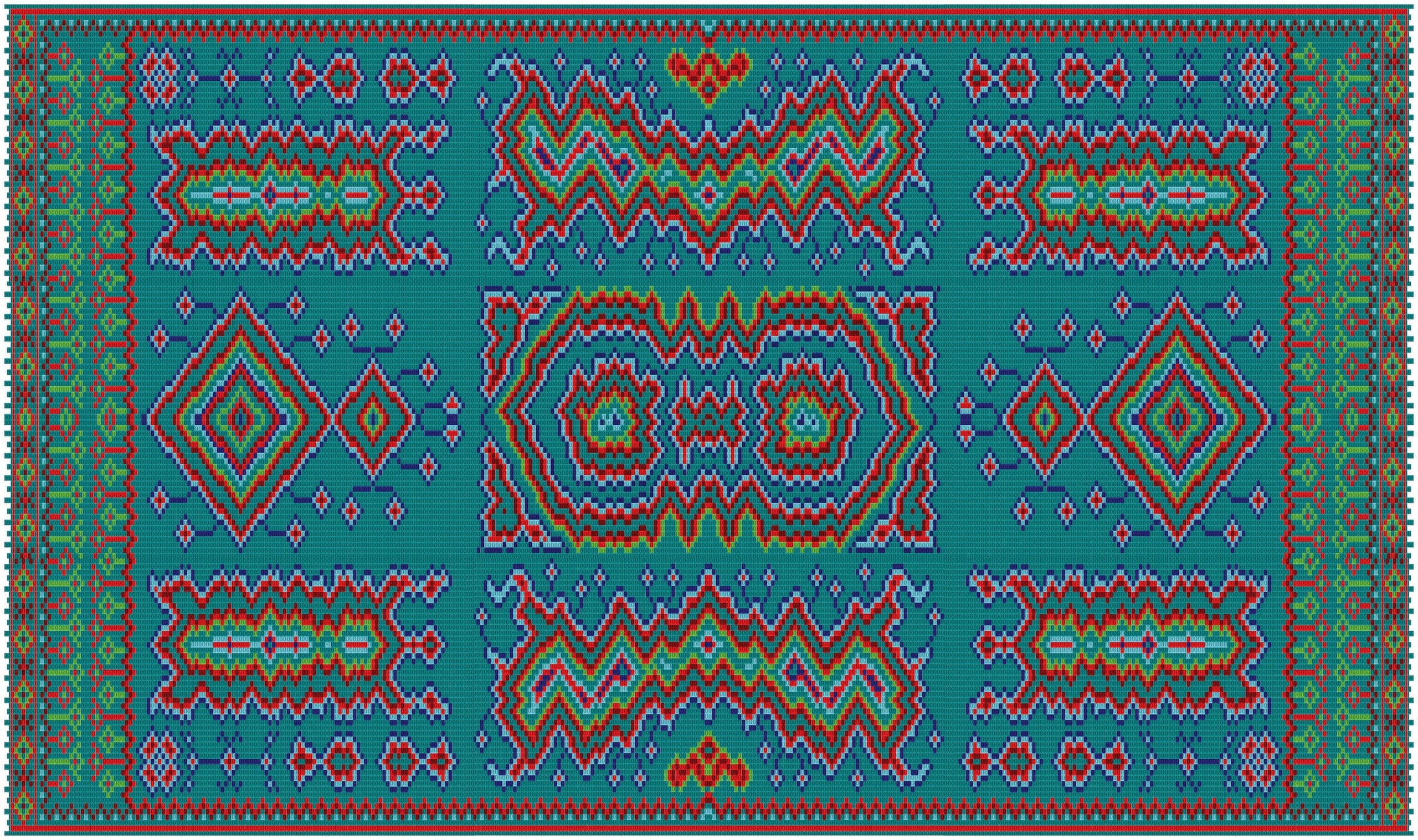 What emerges is a meditative and improvisational process: the designs may initially appear to echo traditional carpet patterns, yet they are in fact generated by numerical and algorithmic decisions made during composition. This tension between the familiar and the unfamiliar destabilizes assumptions about authenticity, craftsmanship, and cultural memory. The pixelated geometries both honor the aesthetics of handwoven traditions and question how heritage adapts when mediated by contemporary tools.