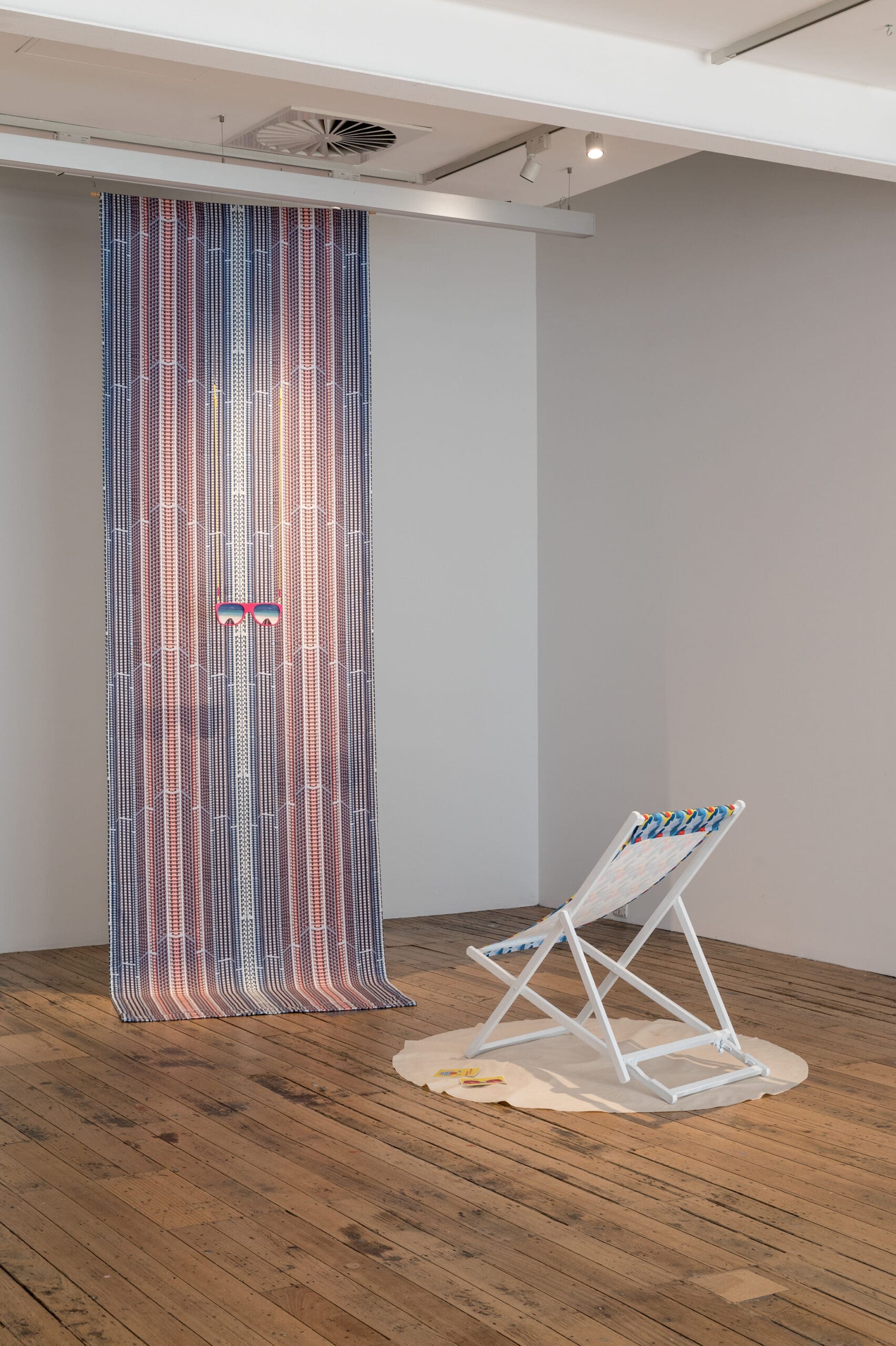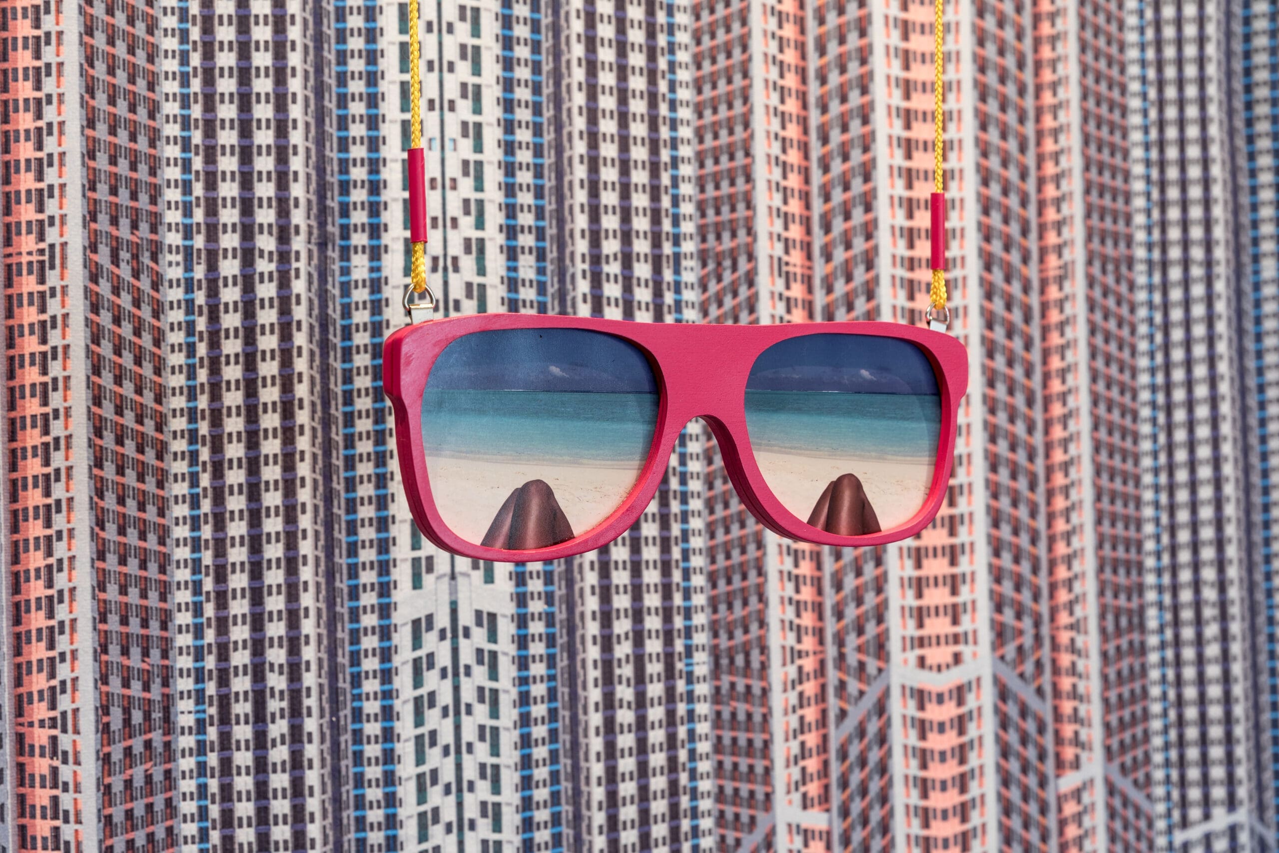 इस इंस्टॉलेशन के केंद्र में रखा समुद्र-तट का तौलिया मालदीव की पहली सार्वजनिक आवास योजना से प्रेरित एक आवर्ती पैटर्न लिए हुए है, जिसे राजधानी के पास पुनः प्राप्त लैगून भूमि पर, राज्य-नेतृत्वित जनसंख्या एकीकरण कार्यक्रम के हिस्से के रूप में बनाया गया था। जब पर्यटक सफेद-रेत वाले समुद्र-तटों पर लेटकर आराम करते हैं, बाहरी द्वीपों से आने वाले मालदीवियन लोग स्वास्थ्य सेवाओं और शिक्षा की उपलब्धता के लिए शहर में बसने की आकांक्षा रखते हैं। इस बीच, रिज़ॉर्ट द्वीप बारीकी से संजोए गए, विशिष्ट एन्क्लेव बने रहते हैं, जो रोजमर्रा के संघर्षों से अछूते, अलग-थलग स्वर्ग के भ्रम को और मजबूत करते हैं।
